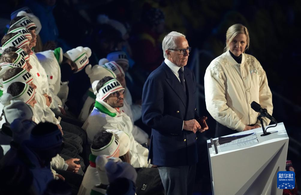 2月22日,米兰-科尔蒂纳冬奥会组委会主席乔瓦尼·马拉戈(前左)在闭幕式上发言。