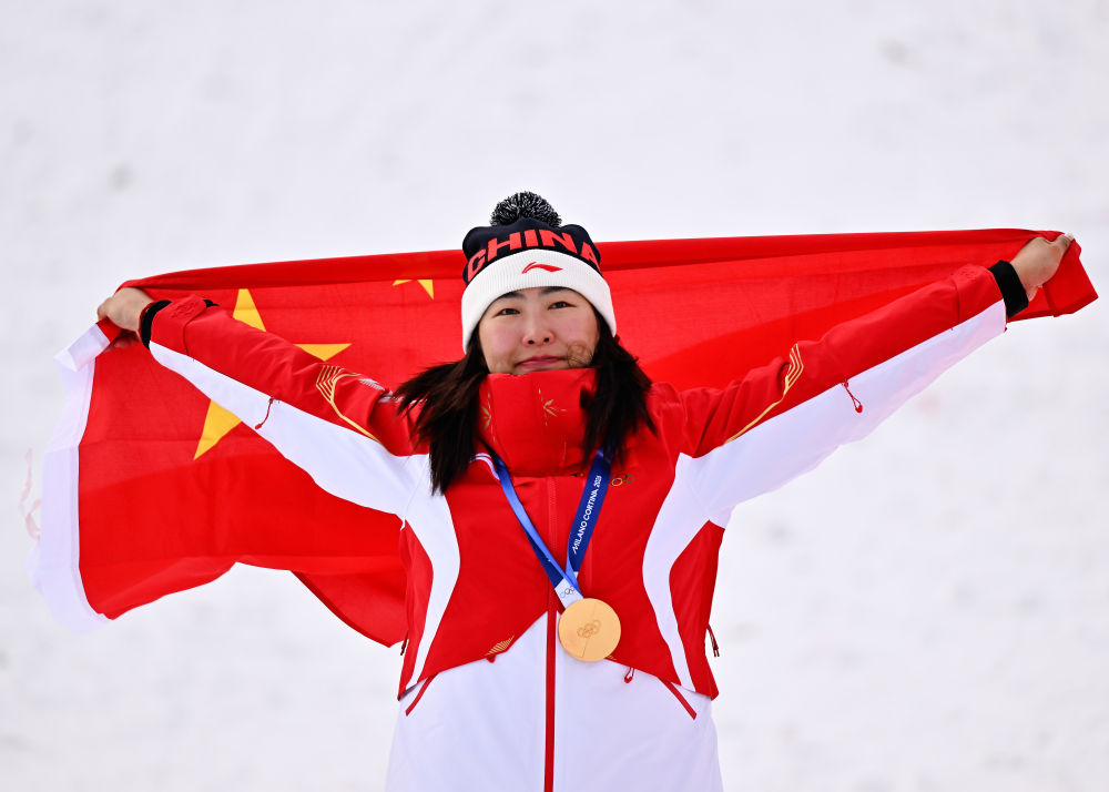 2月22日,谷爱凌在颁奖仪式后。当地时间2月22日,在意大利利维尼奥举行的米兰-科尔蒂纳冬奥会自由式滑雪女子U型场地技巧决赛中,中国选手谷爱凌获得冠军。新华社记者 王鹏 摄
