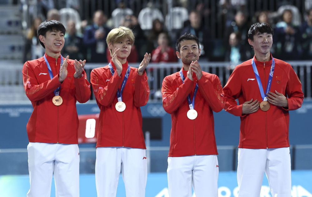 2月17日,李文淏、刘瀚彬、宁忠岩、吴宇(从左至右)在颁奖仪式上。当地时间2月17日,米兰-科尔蒂纳冬奥会速度滑冰男子团体追逐决赛在意大利米兰举行,中国队获季军。新华社记者 李京 摄