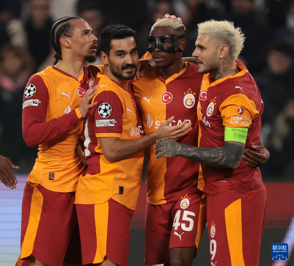 2月25日,加拉塔萨雷队球员奥斯梅恩(右二)与队友庆祝进球。