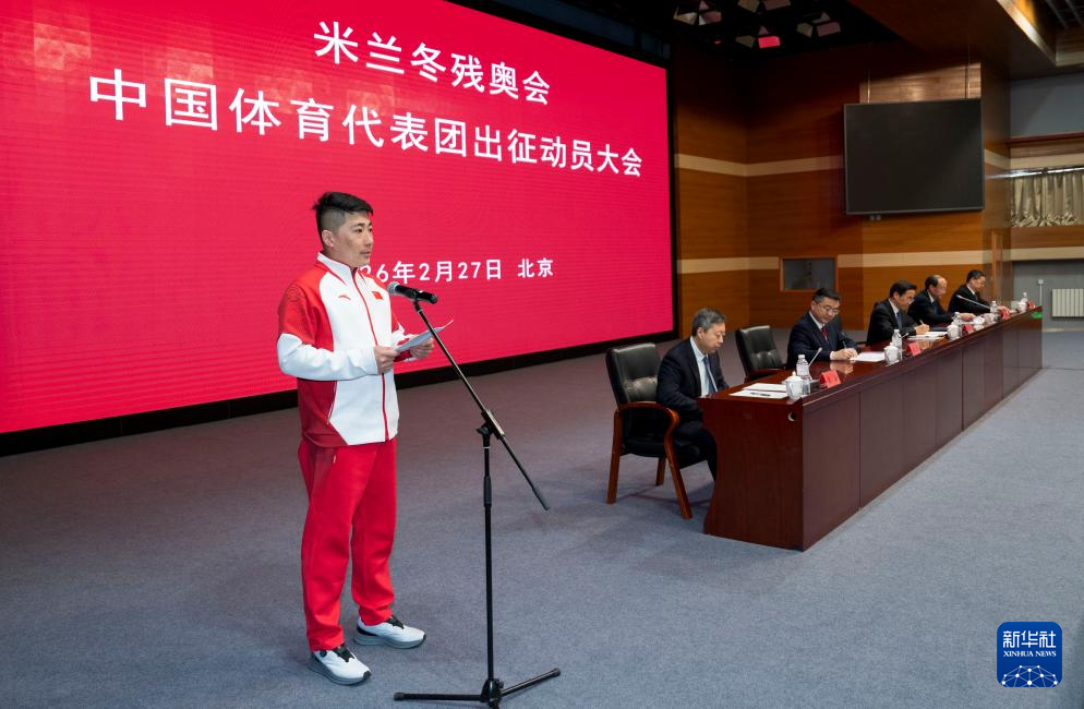 2月27日,运动员、教练员等出席米兰冬残奥会中国体育代表团出征动员大会。