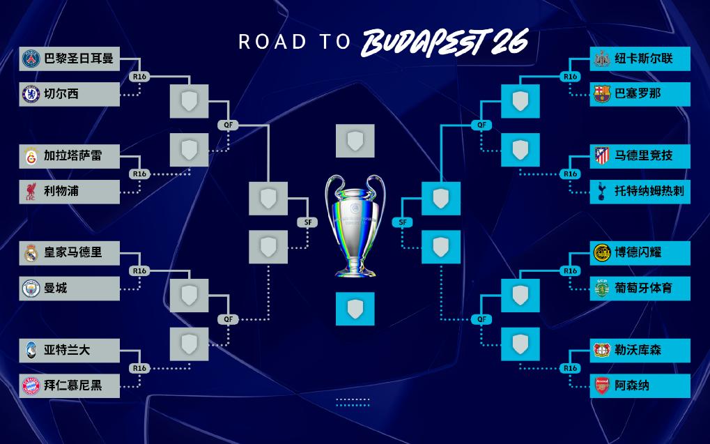 欧冠16强赛两回合比赛将分别于3月10日-11日和3月17日-18日进行,决赛将于5月30日在匈牙利布达佩斯的普斯卡什竞技场举行。