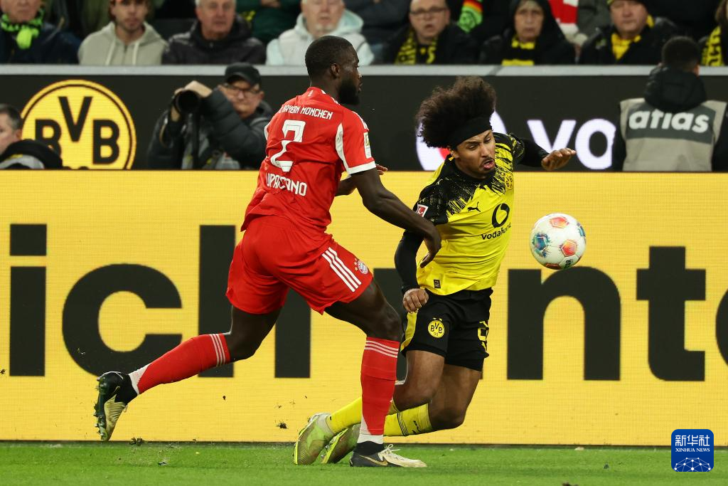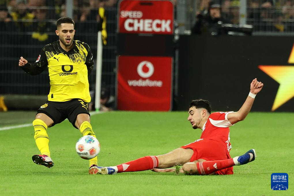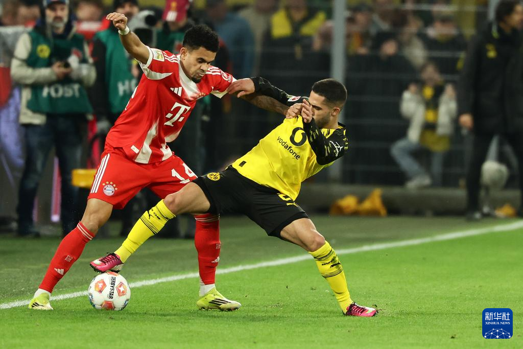 2月28日,拜仁慕尼黑队球员迪亚茨(左)和多特蒙德队球员科托在比赛中拼抢。