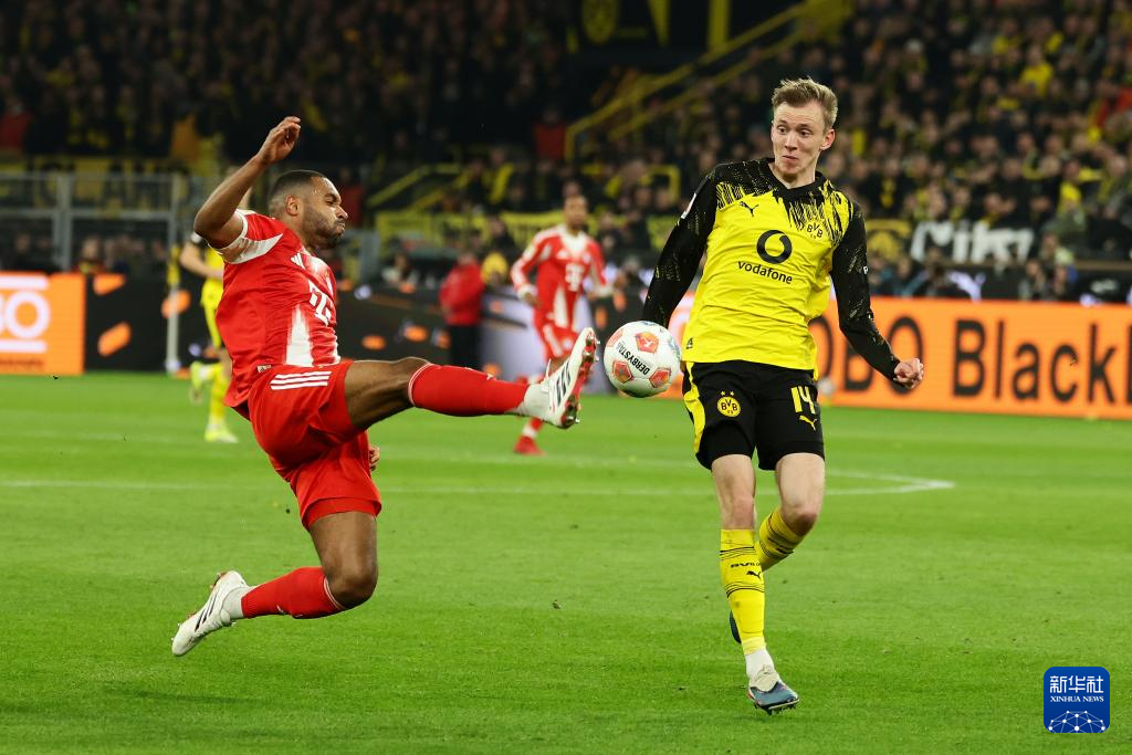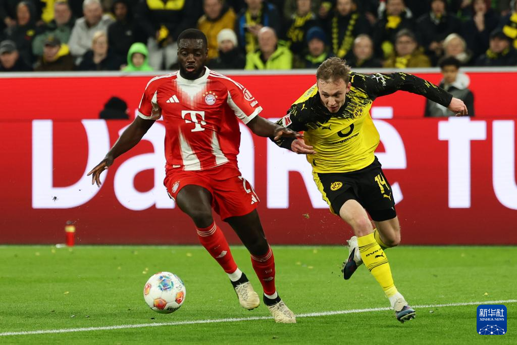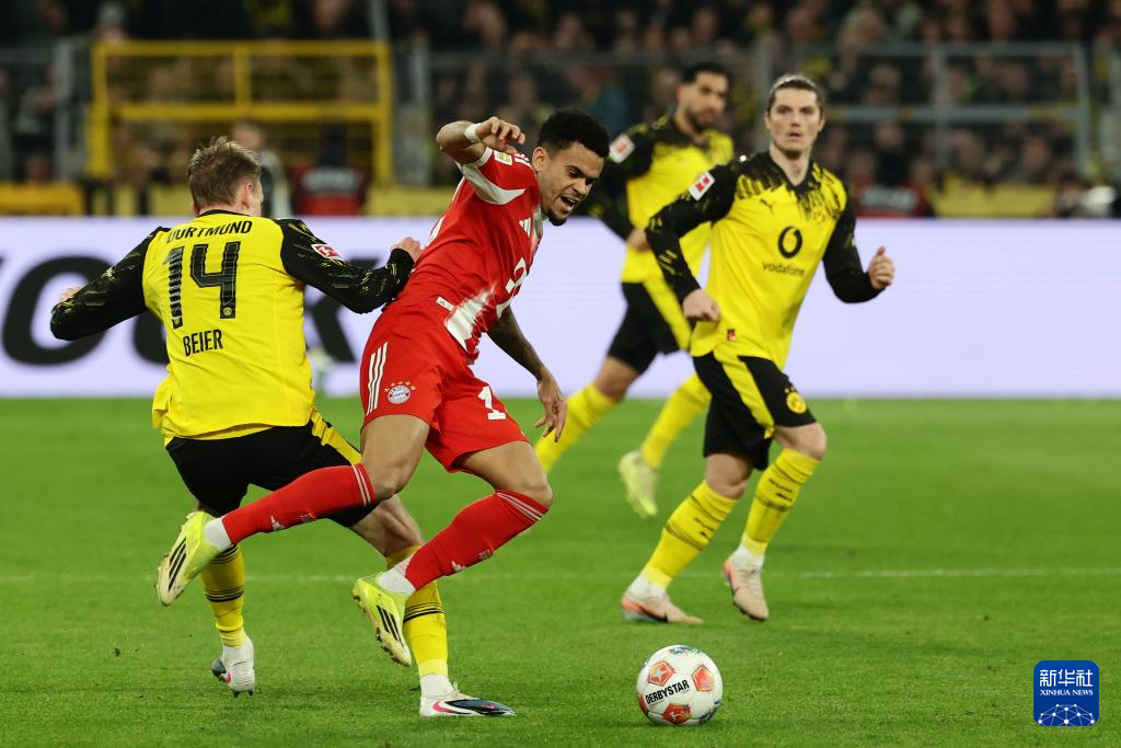 2月28日,拜仁慕尼黑队球员迪亚茨(前右)和多特蒙德队球员拜尔在比赛中拼抢。