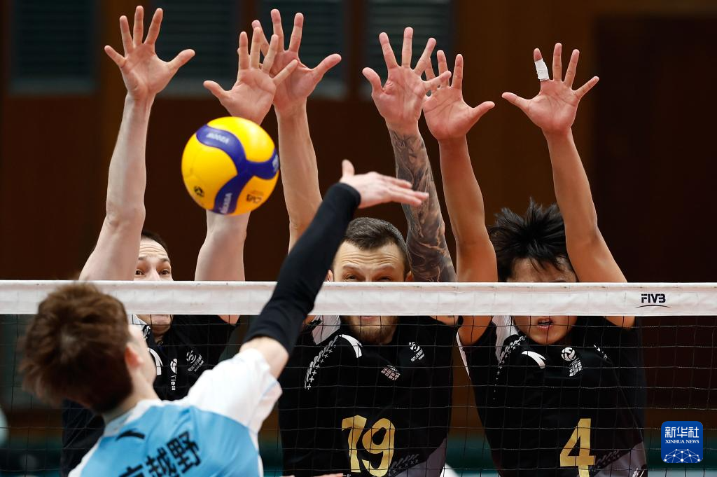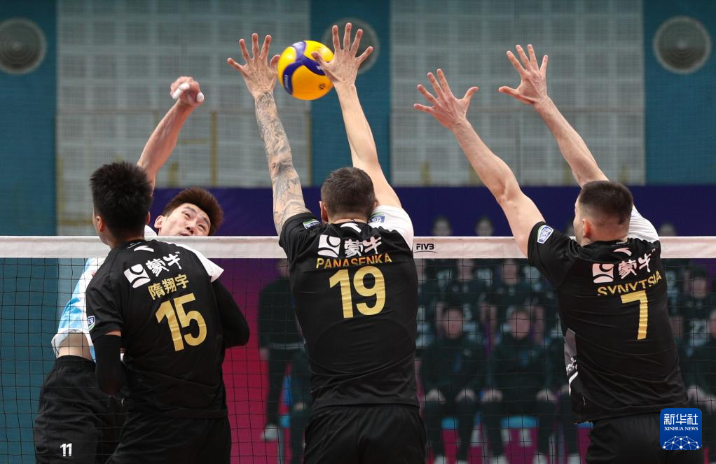 3月5日,保定沃隶队球员隋翔宇、康斯坦丁、辛尼察(前排从左至右)在比赛中拦网北京北汽队球员江川。