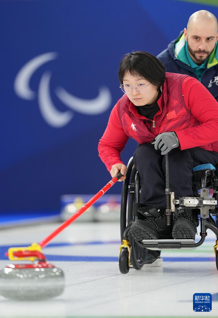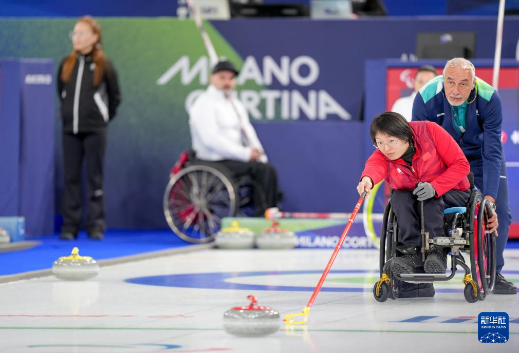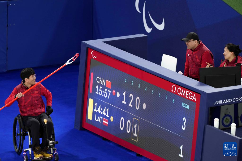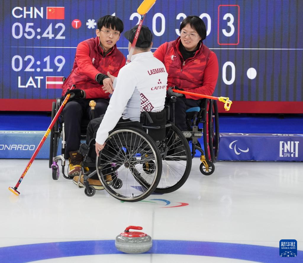 当地时间3月5日,在意大利科尔蒂纳举行的米兰-科尔蒂纳冬残奥会轮椅冰壶混双循环赛中,中国队10比2战胜拉脱维亚队。
