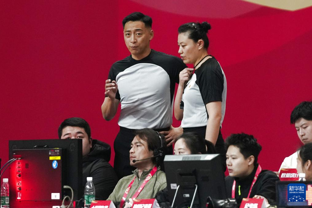 3月6日,主裁判胡静(后右)、第二副裁判高昳杰在查看比赛回放。