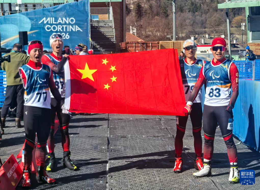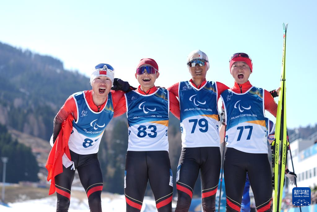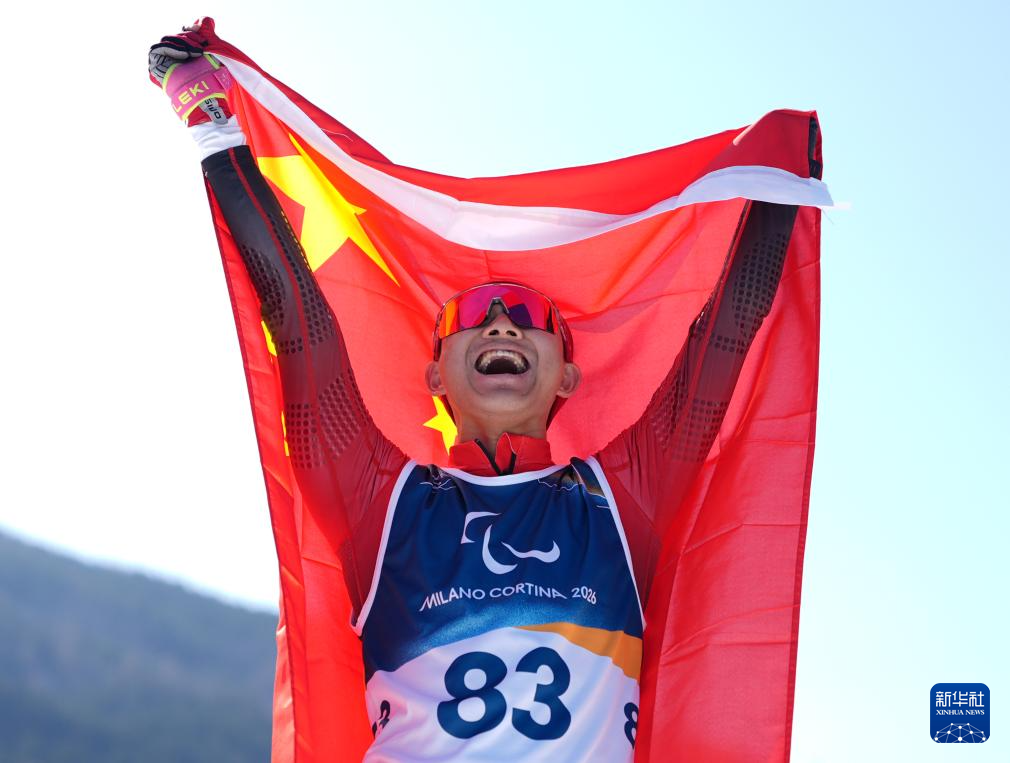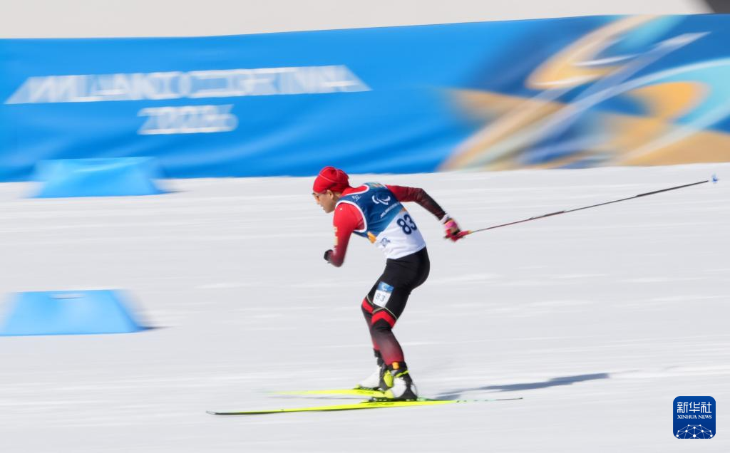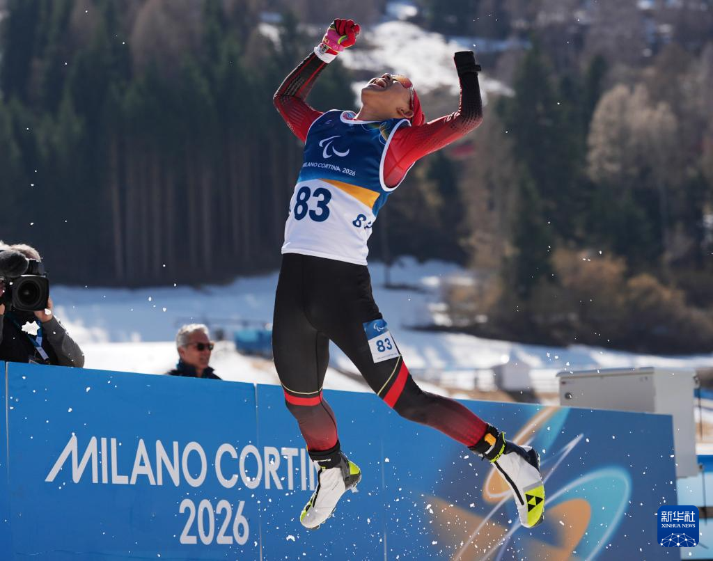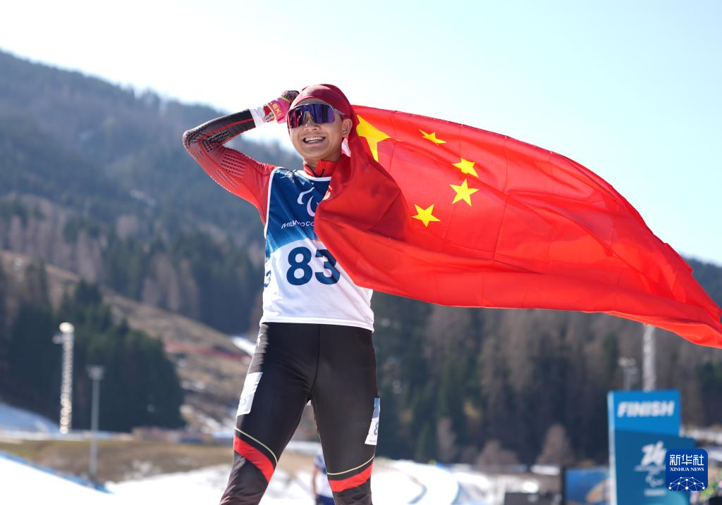当地时间3月7日,在意大利泰塞罗举行的米兰-科尔蒂纳冬残奥会冬季两项男子短距离(站姿)比赛中,中国选手蔡佳云获得冠军。