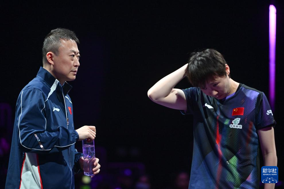 3月10日,王曼昱(右)与教练马琳在比赛间歇交流。