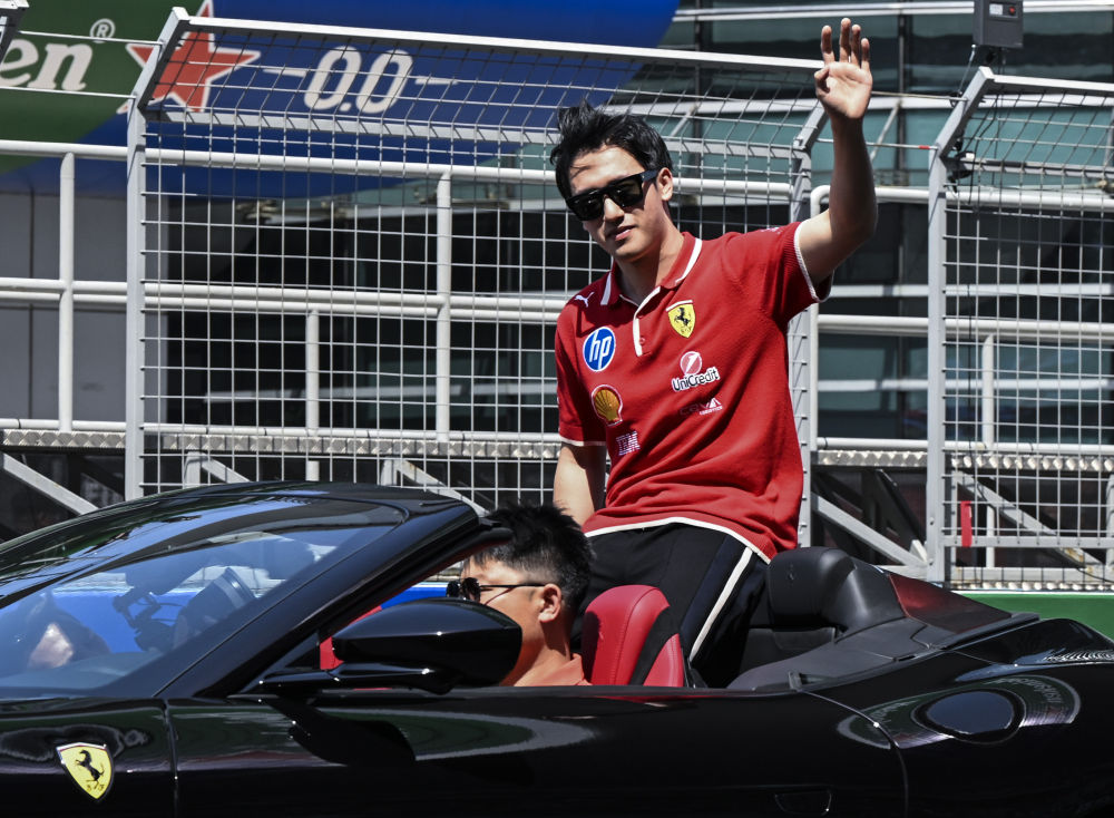 2025年3月23日,法拉利车队储备车手周冠宇参加车手巡游仪式。当日,世界一级方程式赛车锦标赛(F1)中国大奖赛车手巡游仪式在上海国际赛车场举行。新华社记者 贺长山 摄
