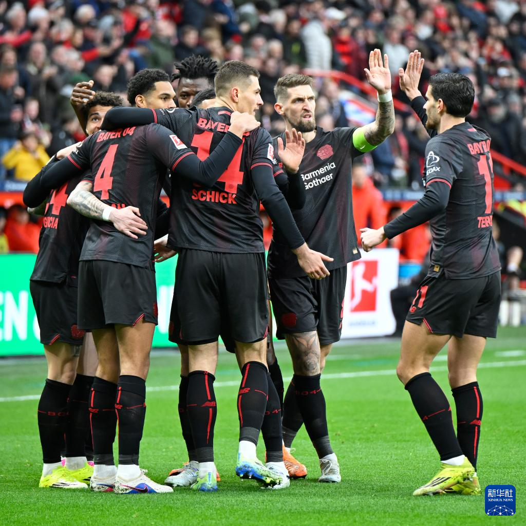 3月14日,勒沃库森队球员在比赛中庆祝进球。