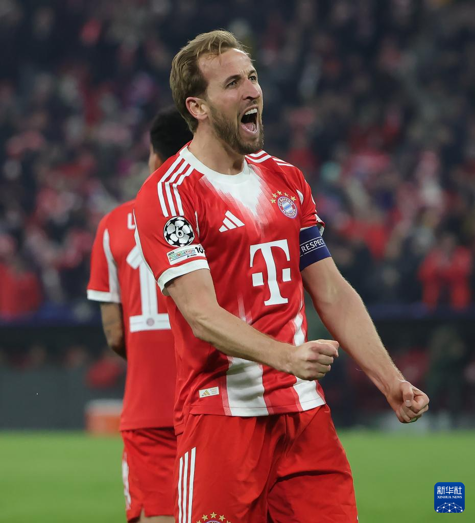 3月18日,拜仁慕尼黑队球员凯恩在比赛中庆祝进球。