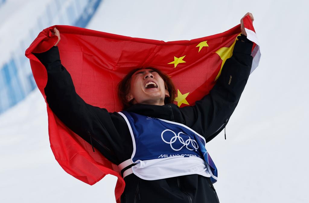 当地时间2026年2月18日,在意大利利维尼奥举行的米兰-科尔蒂纳冬奥会单板滑雪男子坡面障碍技巧决赛中,中国选手苏翊鸣夺得冠军。新华社记者 王鹏 摄
