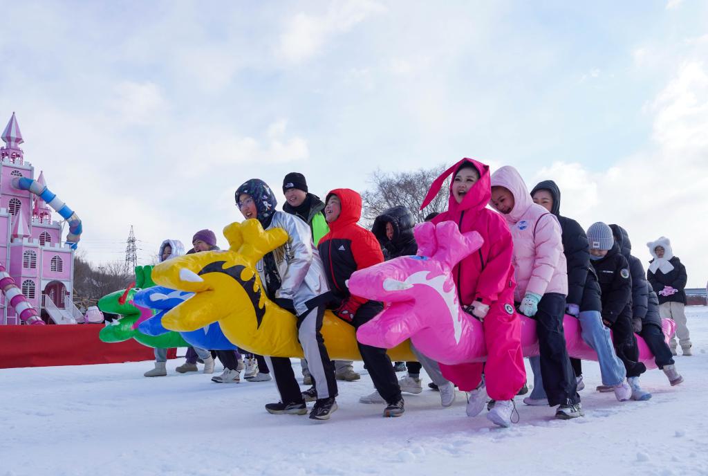 2025年12月3日,吉林市中小学生在吉林市纳美山谷度假区参加“雪地龙舟”趣味活动。新华社记者 颜麟蕴 摄