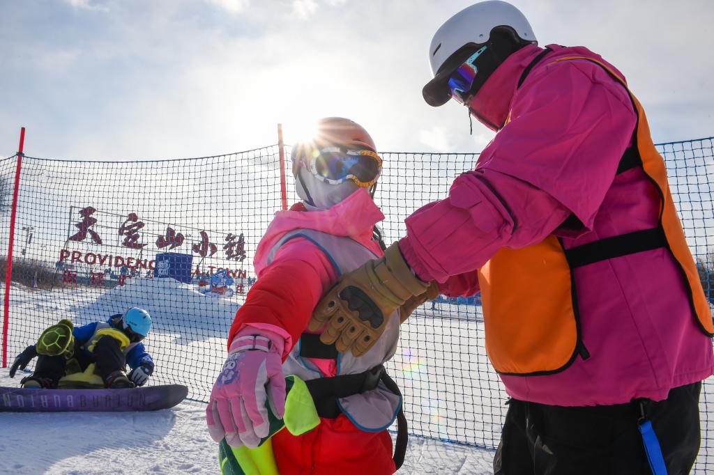 2025年12月3日,吉林省面向全省义务教育阶段学生设立的“冰雪假期”正式开启。图为在长春市天定山滑雪场,一名教练指导学生练习滑雪。新华社记者 张楠 摄