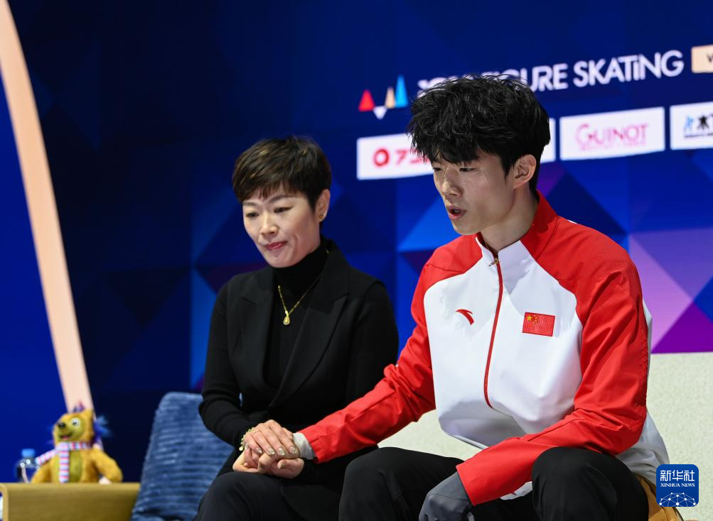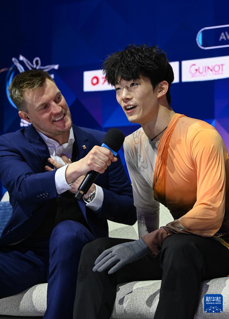 3月28日,中国选手陈昱东(右)在比赛后和主持人互动。他最终获得男子单人滑第16名。