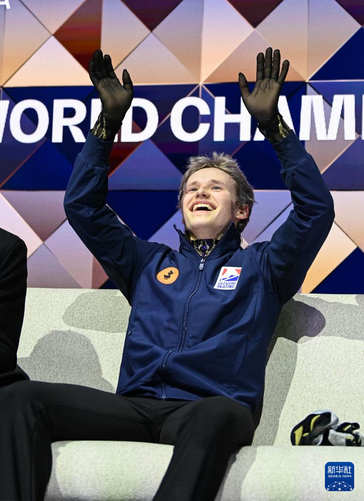 3月28日,美国选手马里宁在比赛后庆祝,他获得男子单人滑冠军。