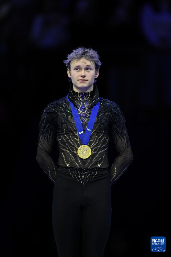 3月28日,冠军美国选手马里宁在男子单人滑颁奖仪式上。