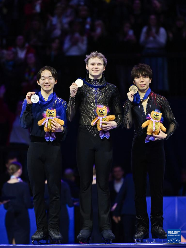 3月28日,冠军美国选手马里宁(中)、亚军日本选手键山优真(左)、季军日本选手佐藤骏在男子单人滑颁奖仪式上。