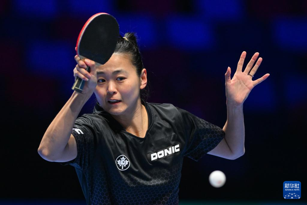 3月30日,加拿大选手张默在女子单打小组赛中回球。最终,她2比3不敌日本选手伊藤美诚。