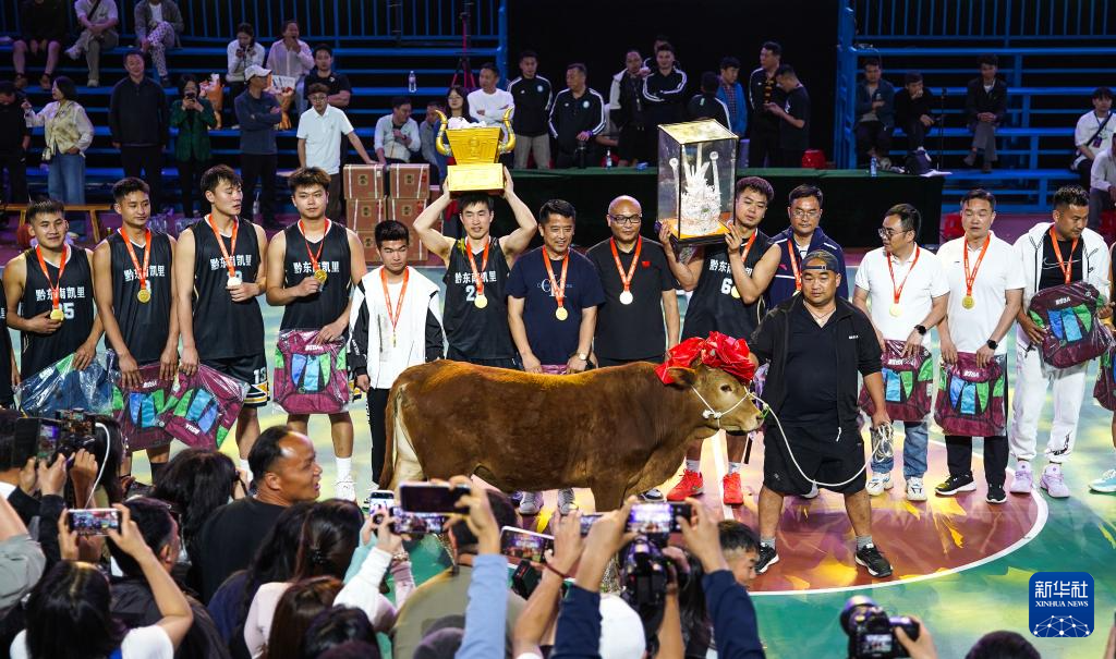 4月11日,获得冠军的凯里市代表队在颁奖仪式上,他们获得的奖品是当地黄牛。