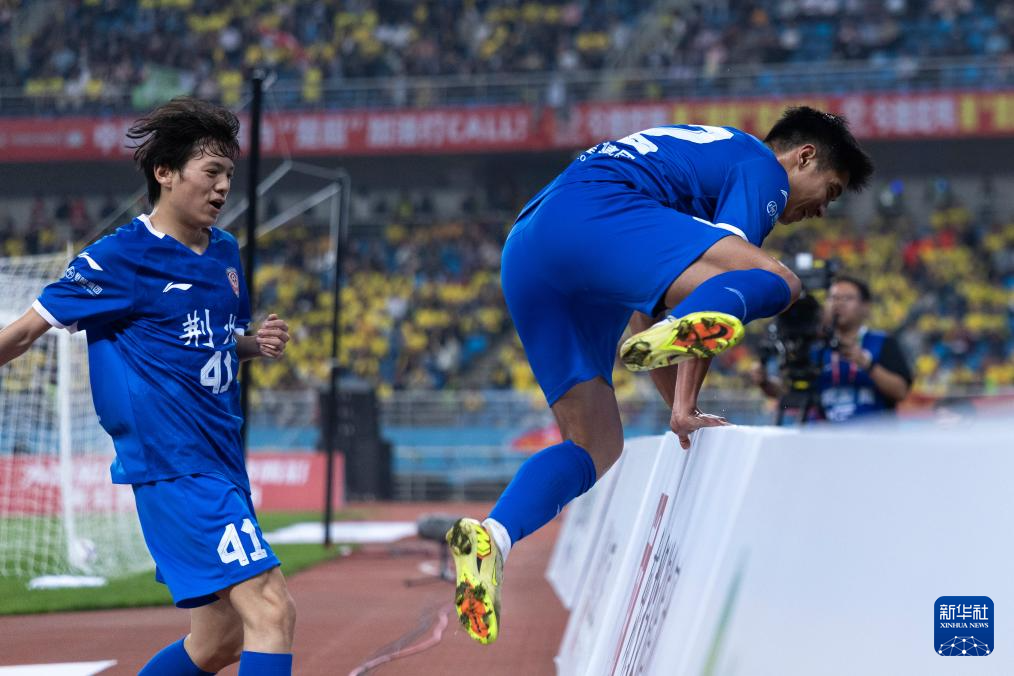 4月12日,荆州恒隆队球员江尔晗(右)在比赛中进球后庆祝。