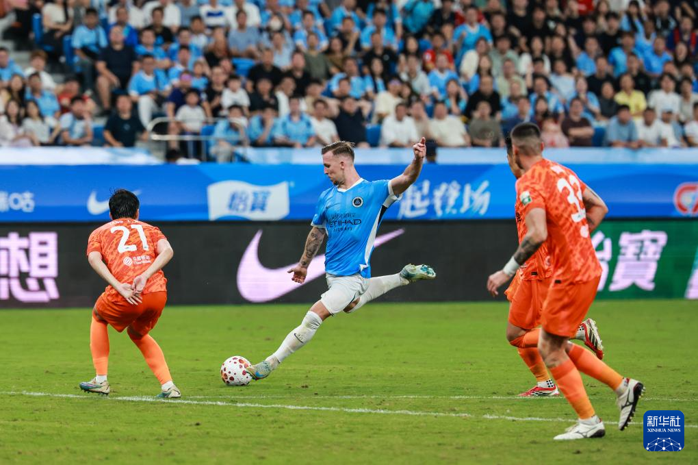 4月12日,深圳新鹏城队球员卡尔采夫(中)在比赛中射门。