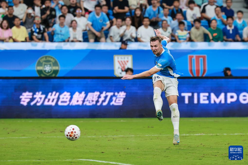 4月12日,深圳新鹏城队球员卡尔采夫在比赛中射门。