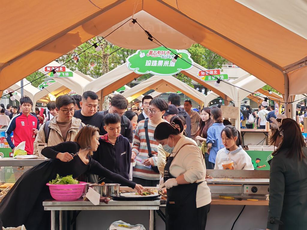 观众在黄石奥体中心外排队免费品尝鳜鱼汤。新华社记者 乐文婉 摄