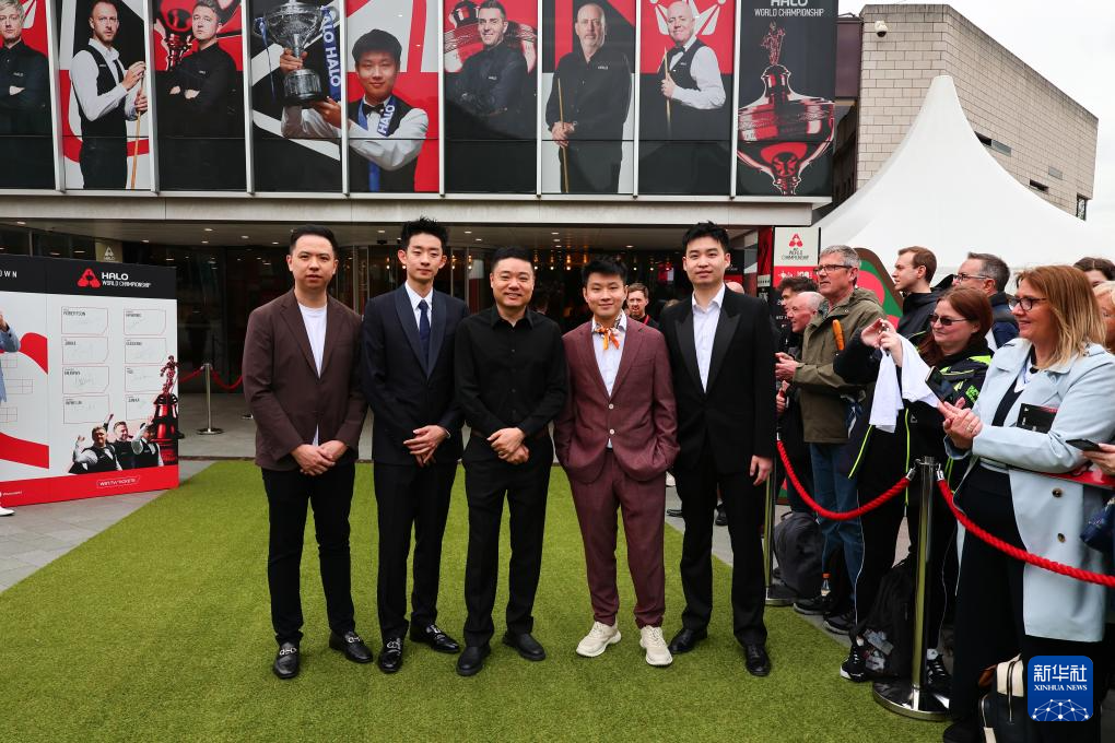 4月17日,中国选手肖国栋、吴宜泽、丁俊晖、赵心童和斯佳辉(由左至右)出席媒体日活动。
