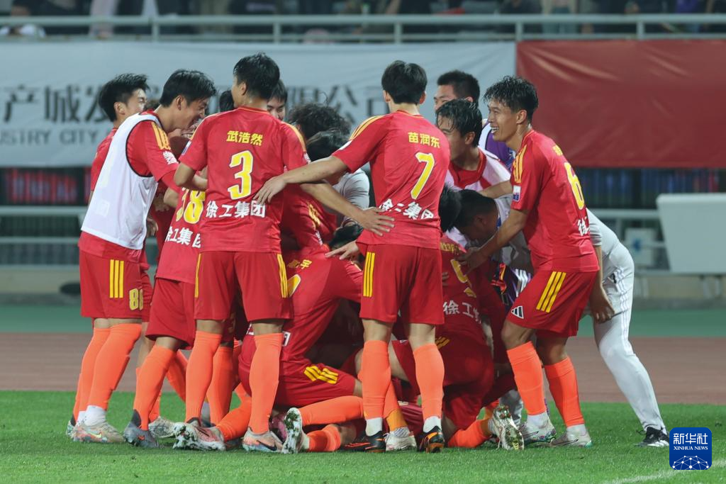 4月18日,徐州队球员在进球后庆祝。
