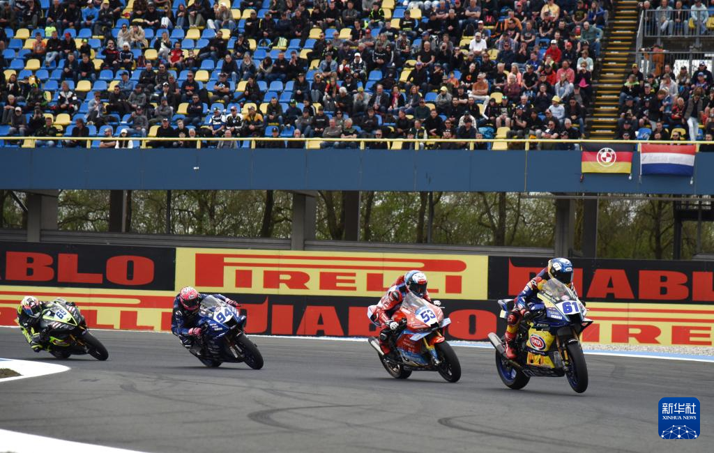 4月18日,“张雪机车”车队法国车手瓦伦丁·德比斯(右二)在比赛中。