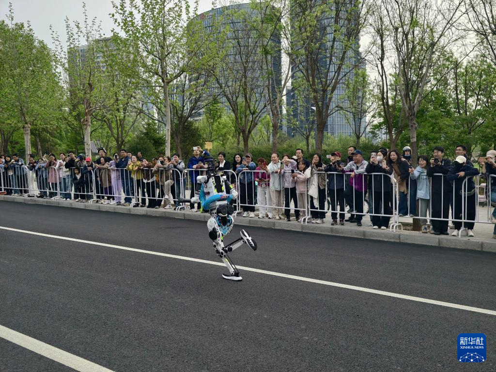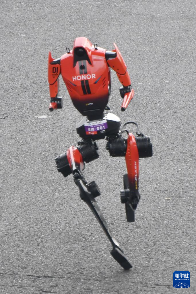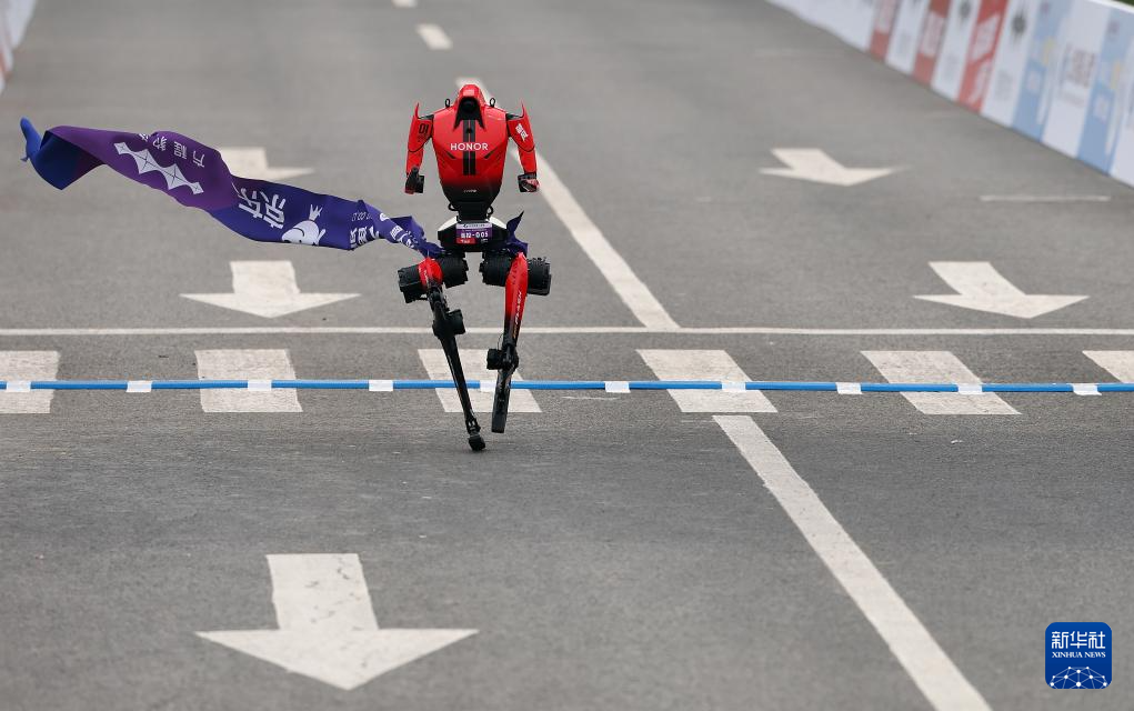 4月19日,杭Y赛队自主人形机器人选手宇树H1在比赛中冲线。