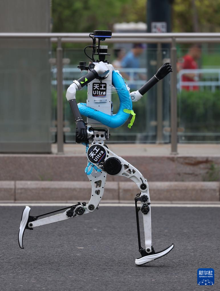 4月19日,天翼队自主人形机器人选手天工Ultra-2025(左前)在比赛中。