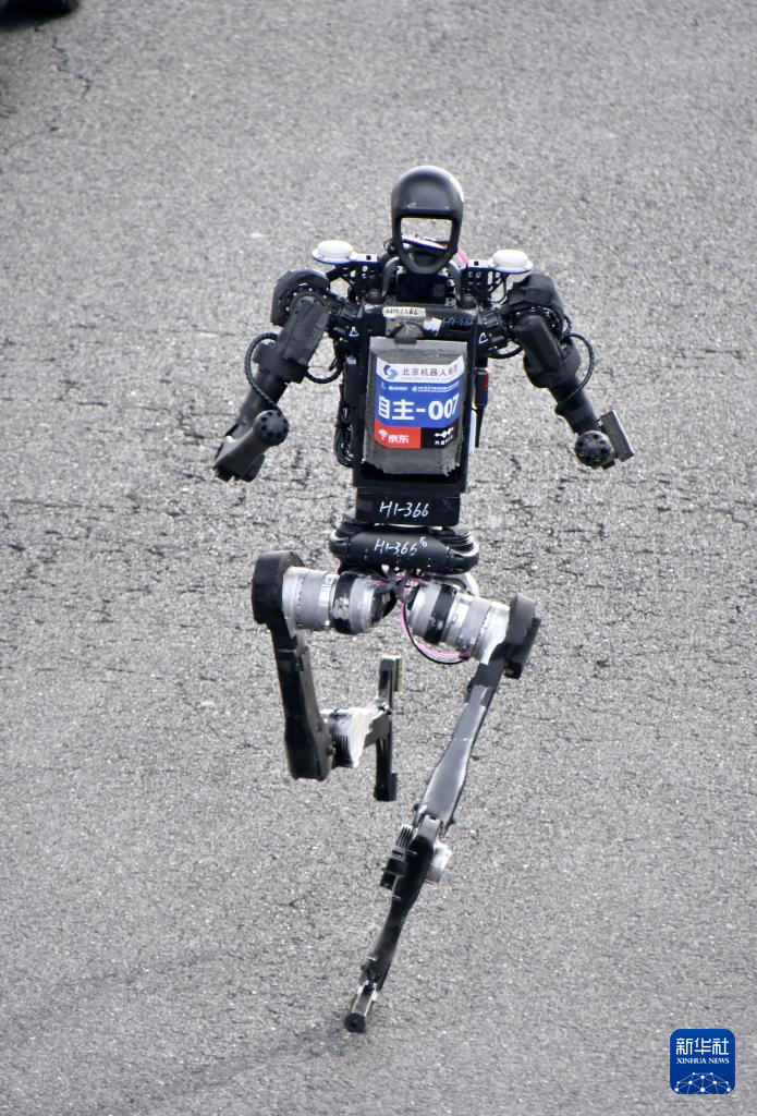 4月19日,齐天大圣队自主人形机器人选手闪电在比赛中冲线。