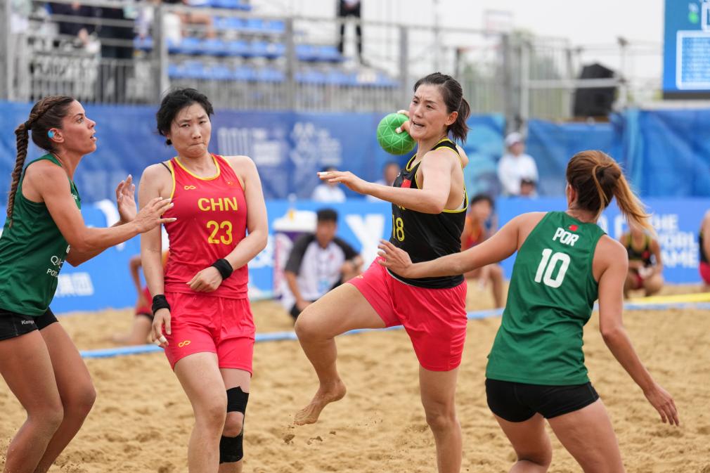 2025年8月8日,沈萍(右二)在成都世运会沙滩手球女子预赛比赛中。新华社记者 刘坤 摄