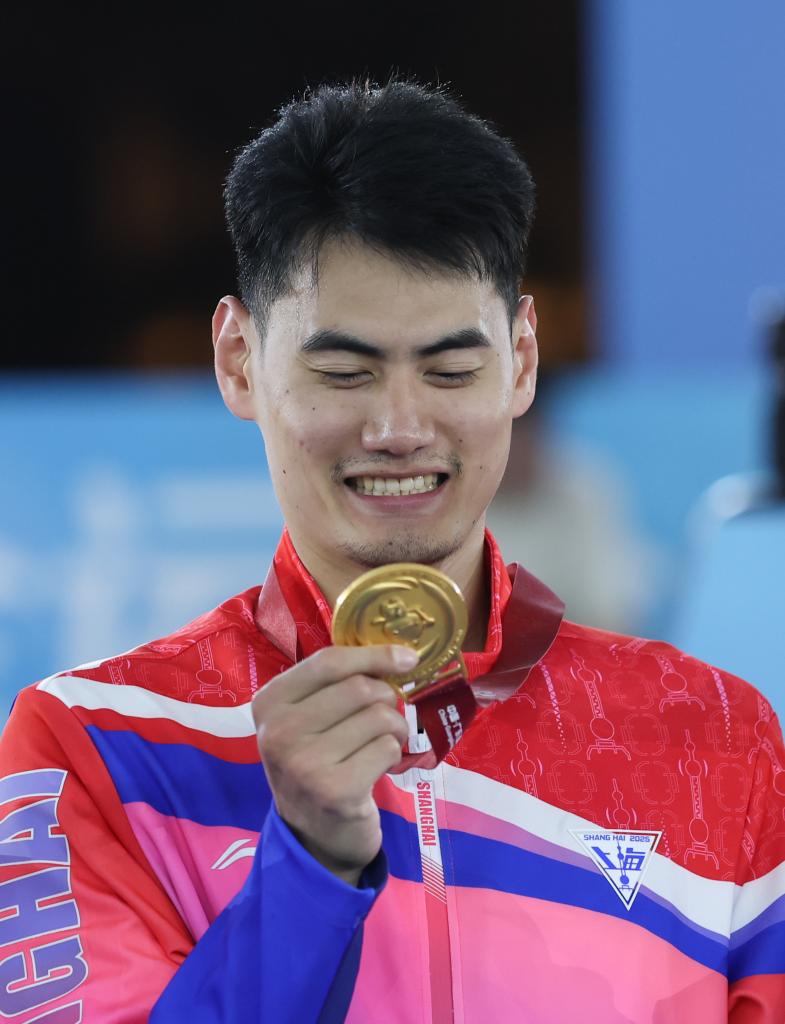 2025年11月15日,上海队球员颜鹏在第十五届全国运动会三人篮球男子决赛后的颁奖仪式上欣赏金牌。新华社记者 孙凡越 摄