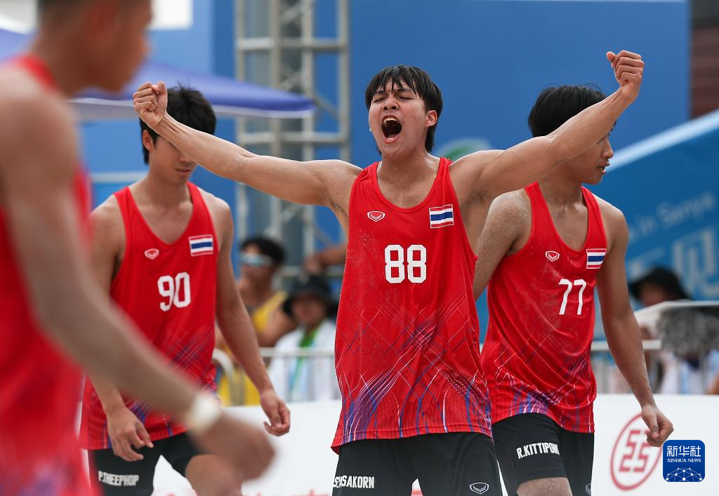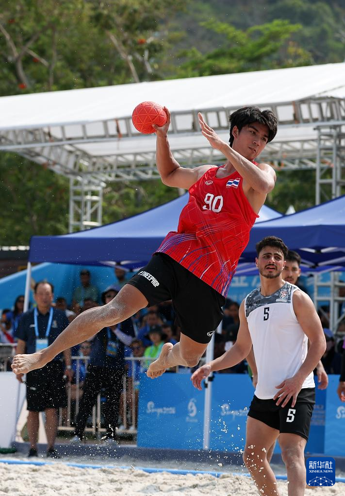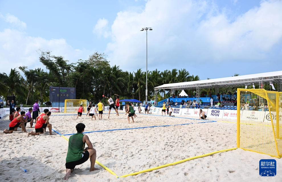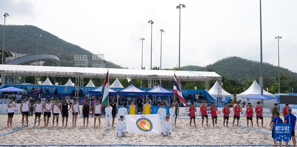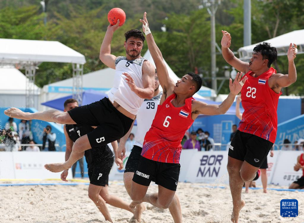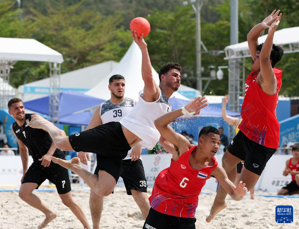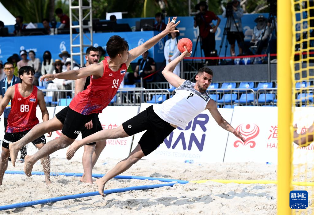 4月21日,在海南三亚举行的第六届亚洲沙滩运动会沙滩手球男子小组赛中,泰国队2比0战胜约旦队,这是三亚亚沙会的首个开赛项目。