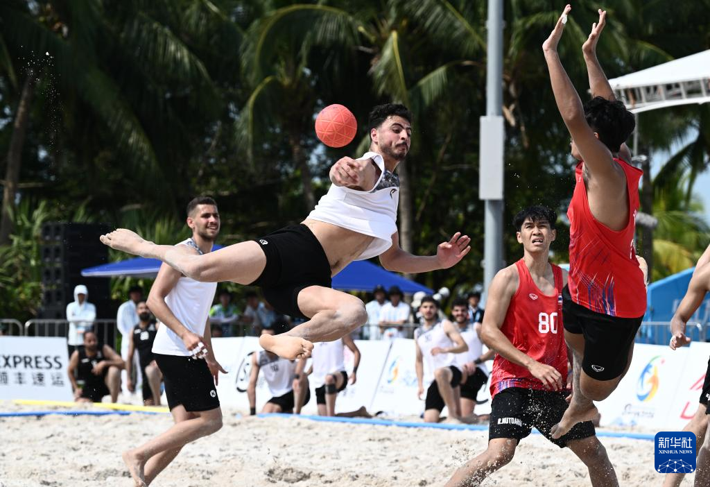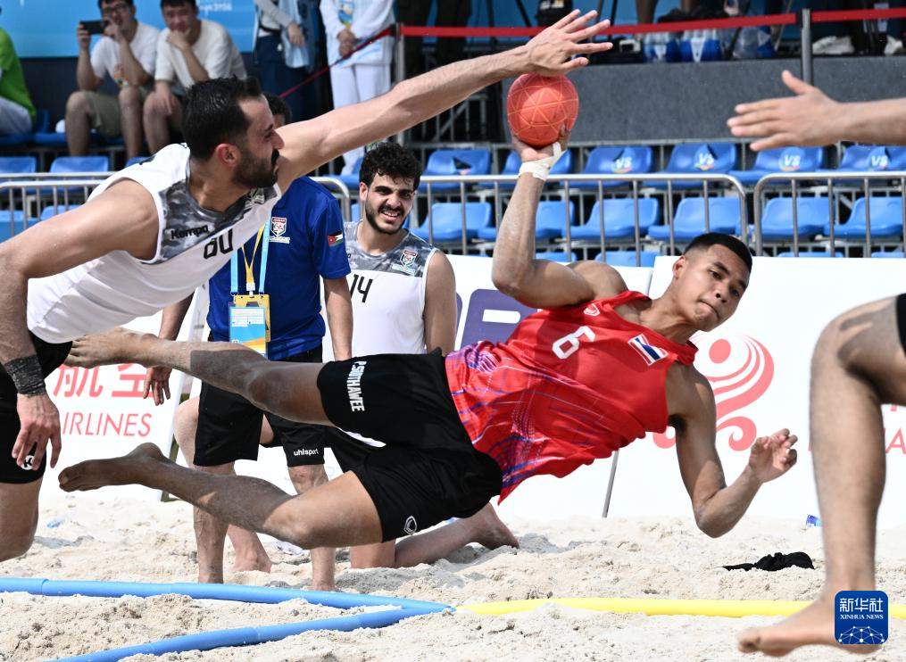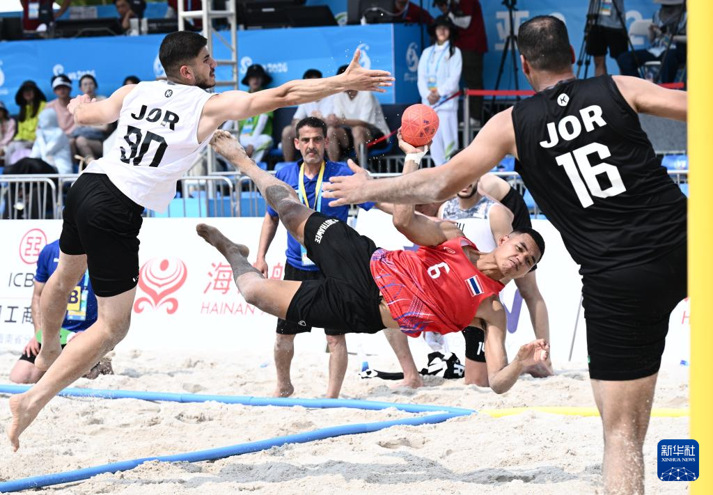 4月21日,在海南三亚举行的第六届亚洲沙滩运动会沙滩手球男子小组赛中,约旦队对阵泰国队,这是三亚亚沙会的首个开赛项目。