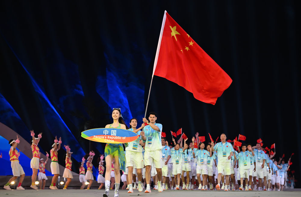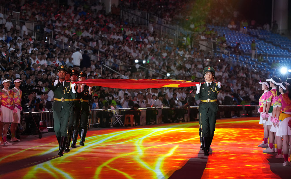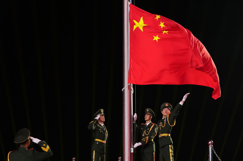 ↑中华人民共和国国旗在开幕式上升起。