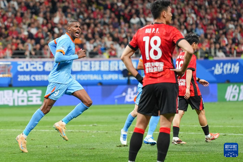4月21日,成都蓉城队球员费利佩(上)在比赛中射门得分。