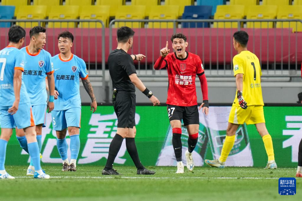 4月21日,主裁判戴弋戈(右)向成都蓉城队球员索罗金(中)出示黄牌。