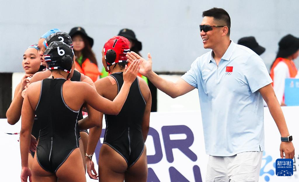 4月23日,中国队主教练王洋(右一)在比赛后和泰国队球员击掌。