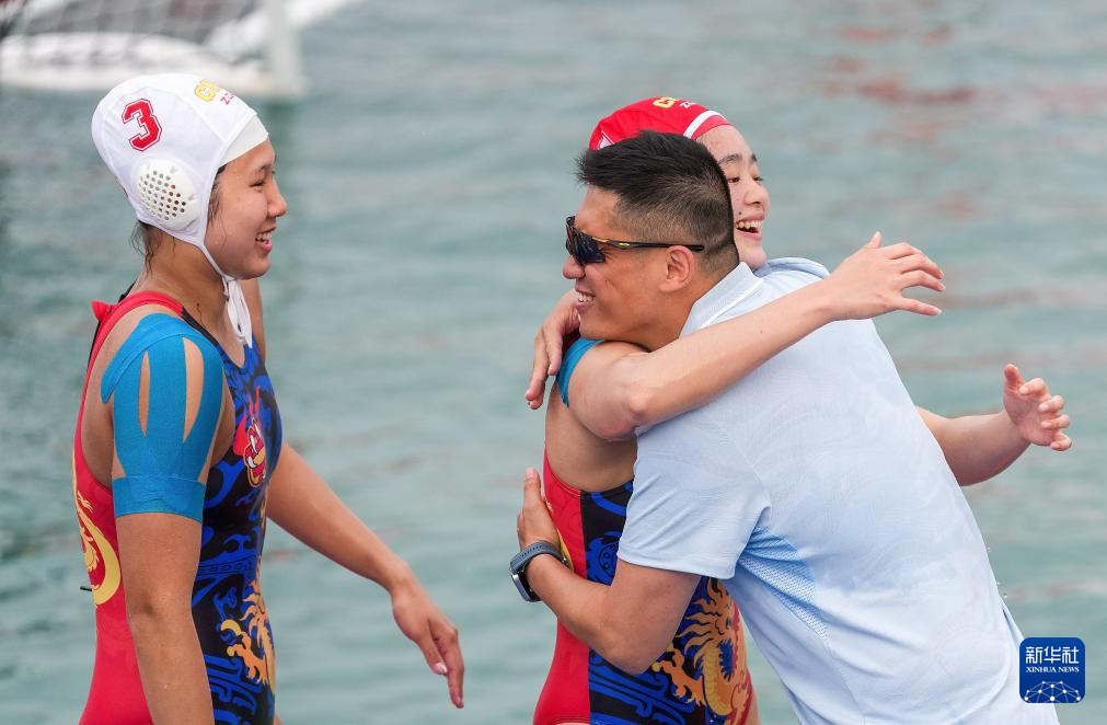 4月23日,中国队主教练王洋(左一)在比赛后和队员拥抱。