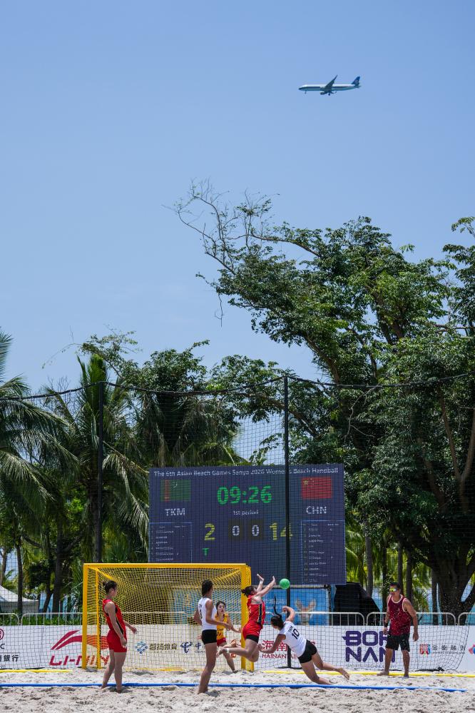 4月26日,在海南三亚举行的第六届亚洲沙滩运动会沙滩手球女子小组赛中,中国队2:0战胜土库曼斯坦队。新华社记者 李博 摄
