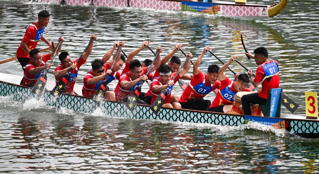 男子组方面,中国队以1分34秒990的成绩摘金,泰国队、中国香港队分获银牌和铜牌。此前,中国男队在12人龙舟100米和200米直道赛中拿下1金1银。