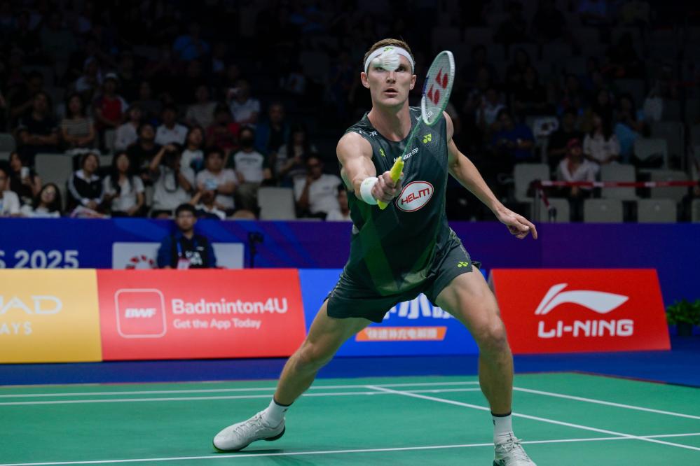 2025年9月18日,安赛龙在比赛中。当日,在广东深圳举行的2025中国羽毛球大师赛男单八分之一决赛中,丹麦选手安赛龙1比2不敌法国选手拉尼耶,无缘八强。新华社发(储焱摄)