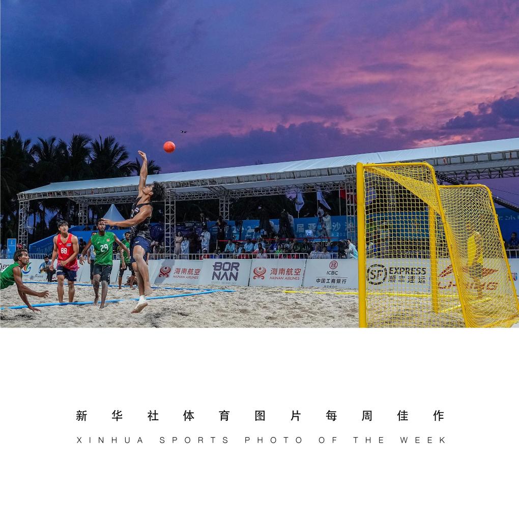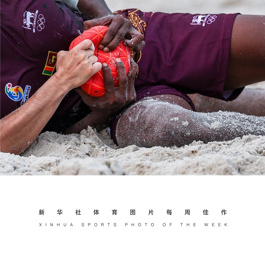 4月23日,斯里兰卡队球员纳马尔·桑吉瓦·阿迪卡里·曼纳佩鲁马·穆迪扬塞拉格和中国香港队球员冯卓熹在比赛中拼抢。4月23日,在海南三亚举行的第六届亚洲沙滩运动会沙滩手球男子小组赛中,中国香港队2比1战胜斯里兰卡队。
