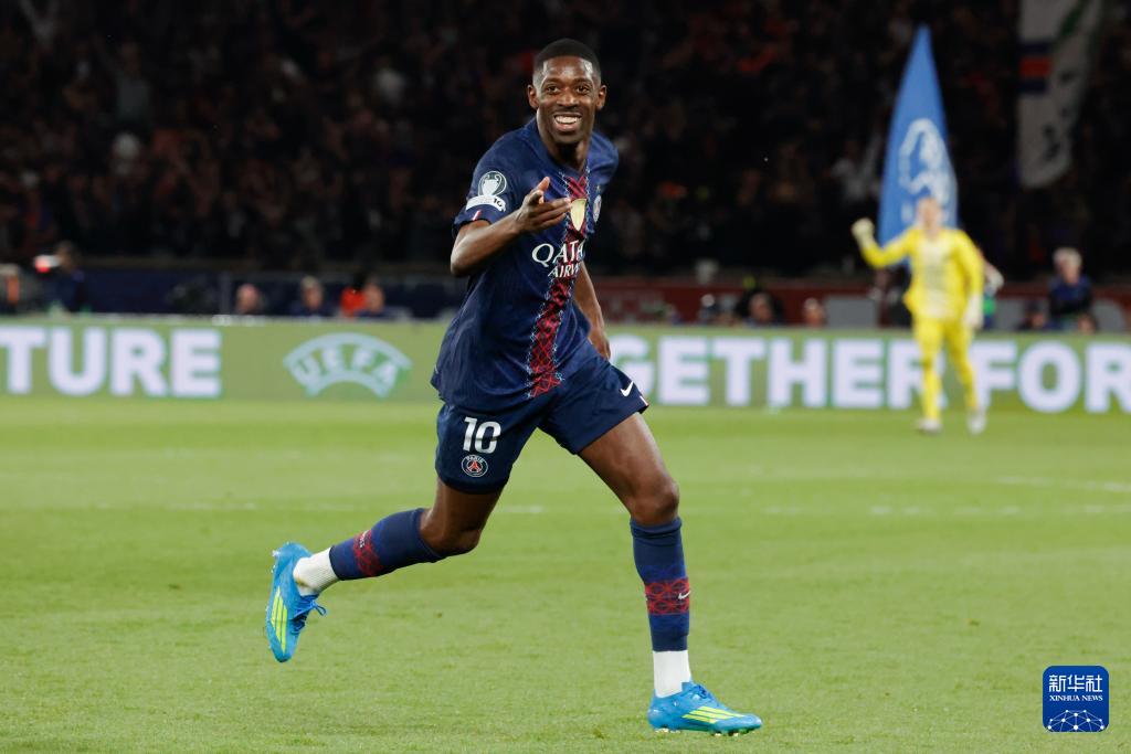 4月28日,巴黎圣日耳曼队球员登贝莱在进球后庆祝。