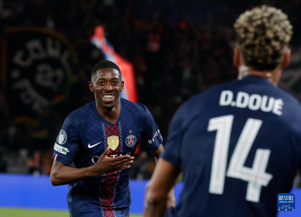 4月28日,巴黎圣日耳曼队球员登贝莱(左)在进球后庆祝。